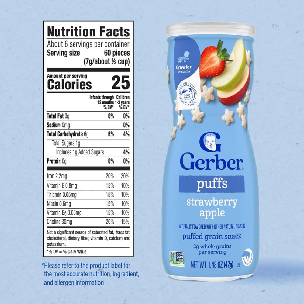 Nuôi dưỡng bé nhỏ của bạn với sự ngon miệng của ngũ cốc bằng cách phục vụ bữa ăn nhẹ với bánh ăn dặm Gerber Puffs vào giờ ăn nhẹ.