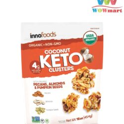 Bánh dừa phủ các loại hạt Inno Foods Organic Coconut Keto Clusters gồm các hạt như: Pecans (Hạt hồ đào), Almonds (hạt hạnh nhân), và Pumpkin Seeds (hạt bí ngô) hữu cơ.