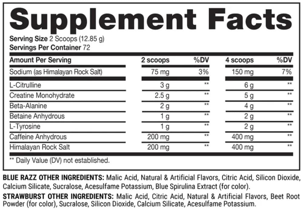 Một số thành phần như: Beta Alanine, Betaine Anhydrous, Creatine và L-Citrulline và các thành phần khác nhằm tăng cường hiệu suất, cung cấp năng lượng mạnh mẽ và sức bền cơ bắp khi bạn cần.