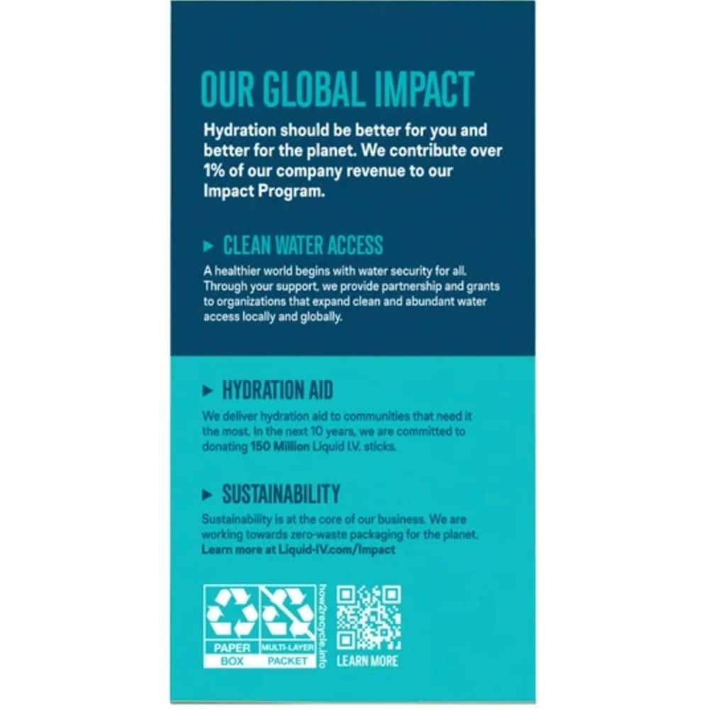 Liquid I.V.® Hydration Multiplier® là thực phẩm bổ sung có đường và chất tạo ngọt (steviol glycosides từ Stevia), chứa chất điện giải (natri và kali) và vitamin (B3, B5, B6, B12 và C). Sản phẩm này có dạng bột điện giải để tăng cường hydrat hóa (*) và giúp phục hồi sự cân bằng điện giải bị mất do tập thể dục, nhiệt độ, du lịch và phiêu lưu.