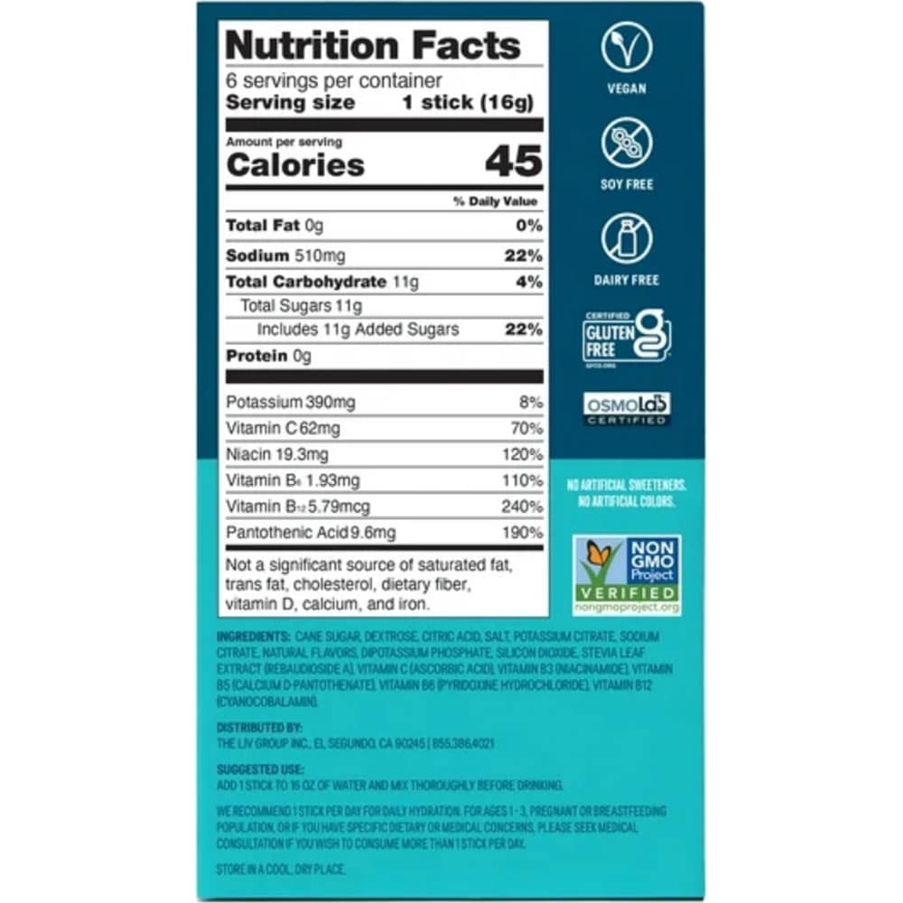 – Liquid I.V.® Hydration Multiplier® là thực phẩm bổ sung có đường và chất tạo ngọt (steviol glycosides từ Stevia), chứa chất điện giải (natri và kali) và vitamin (B3, B5, B6, B12 và C). Sản phẩm này có dạng bột điện giải để tăng cường hydrat hóa (*) và giúp phục hồi sự cân bằng điện giải bị mất do tập thể dục, nhiệt độ, du lịch và phiêu lưu.