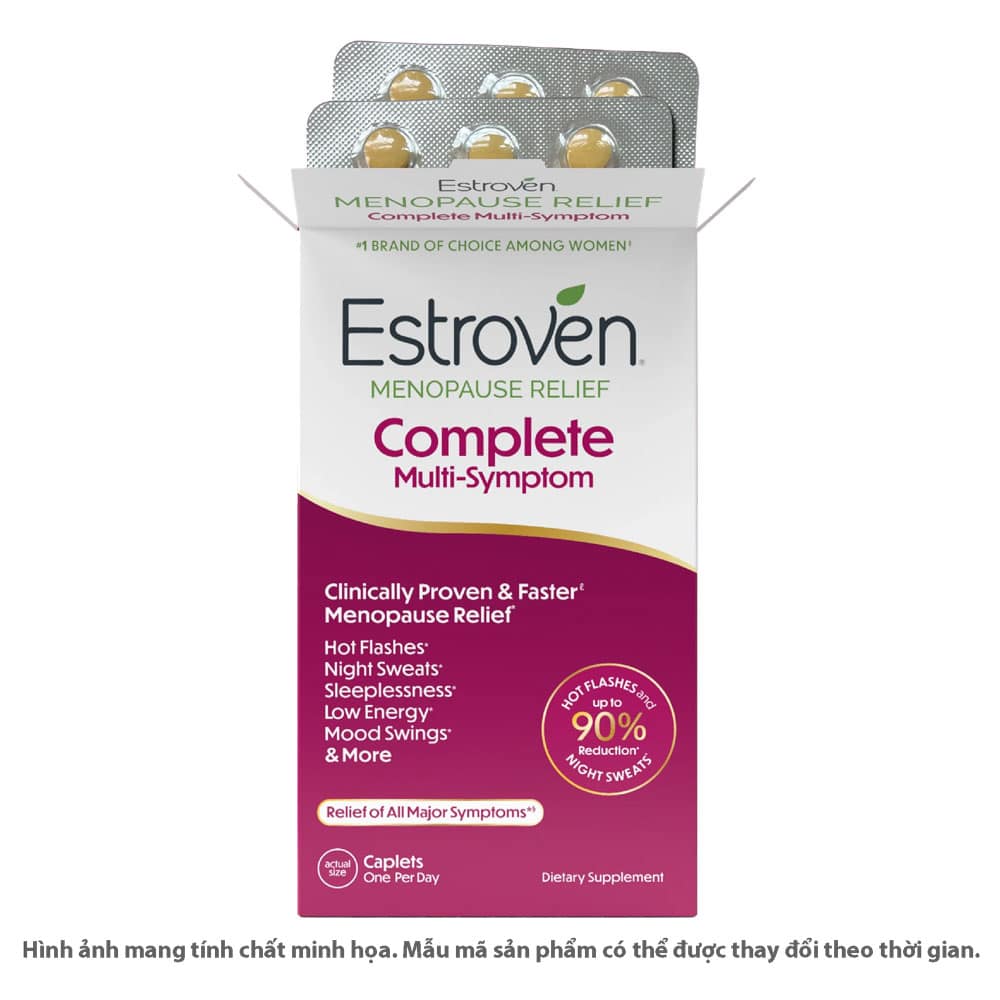 Estroven® Complete Menopause Relief được chứng minh lâm sàng để làm giảm tất cả các triệu chứng mãn kinh đã được thử nghiệm. Công thức tất cả trong một viên này làm giảm các cơn bốc hỏa & đổ mồ hôi ban đêm, hỗ trợ giấc ngủ ngon, tăng cường năng lượng, giúp kiểm soát căng thẳng hàng ngày, tâm trạng, cáu kỉnh và lo lắng liên quan đến mãn kinh. (2)