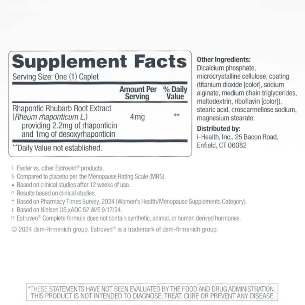 Viên uống cân bằng nội tiết tố Estroven Complete Multi-Symptom Menopause Relief chứa chiết xuất rễ cây đại hoàng Rhapontic dựa trên thực vật đã được chứng minh lâm sàng (ERr 731®), đã được các bác sĩ tin tưởng trong hơn 20 năm để làm giảm các triệu chứng mãn kinh, do tính an toàn và hiệu quả của nó. (2)