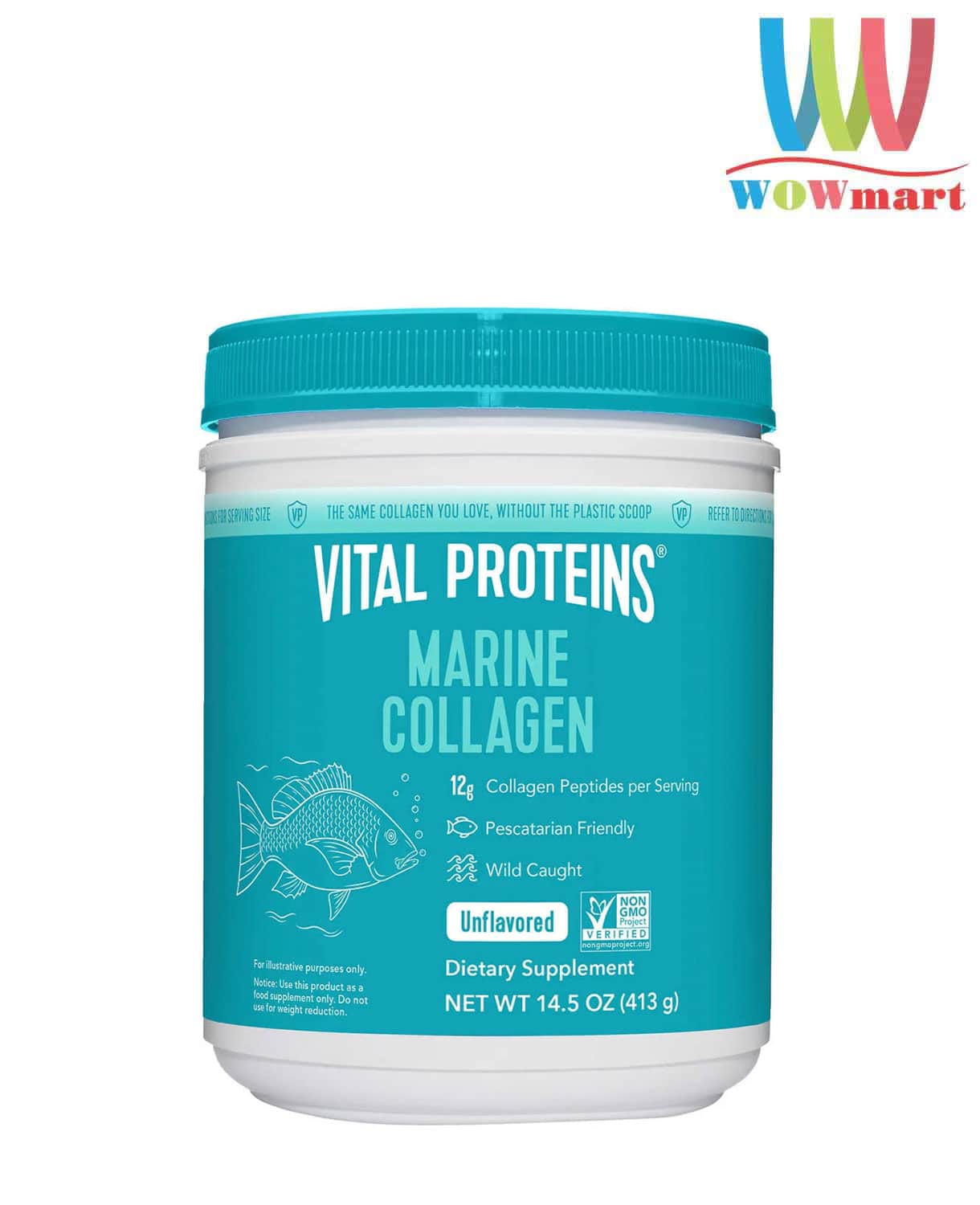 Collagen thủy phân từ cá Vital Proteins Marine Collagen cung cấp 12g Collagen Peptides (Có nguồn gốc từ cá tuyết đánh bắt tự nhiên) và 11g Protein, 0g Sugar, không hương vị.
