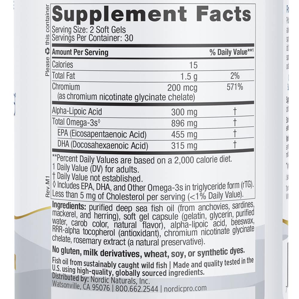 Thành phần khác: purified deep sea fish oil (from anchovies, sardines, mackerel, and herring), soft gel capsule (gelatin, glycerin, purified water, carob color, natural flavor), alpha-lipoic acid, beeswax, RRR-alpha tocopherol (antioxidant), chromium nicotinate glycinate chelate, rosemary extract (a natural preservative).