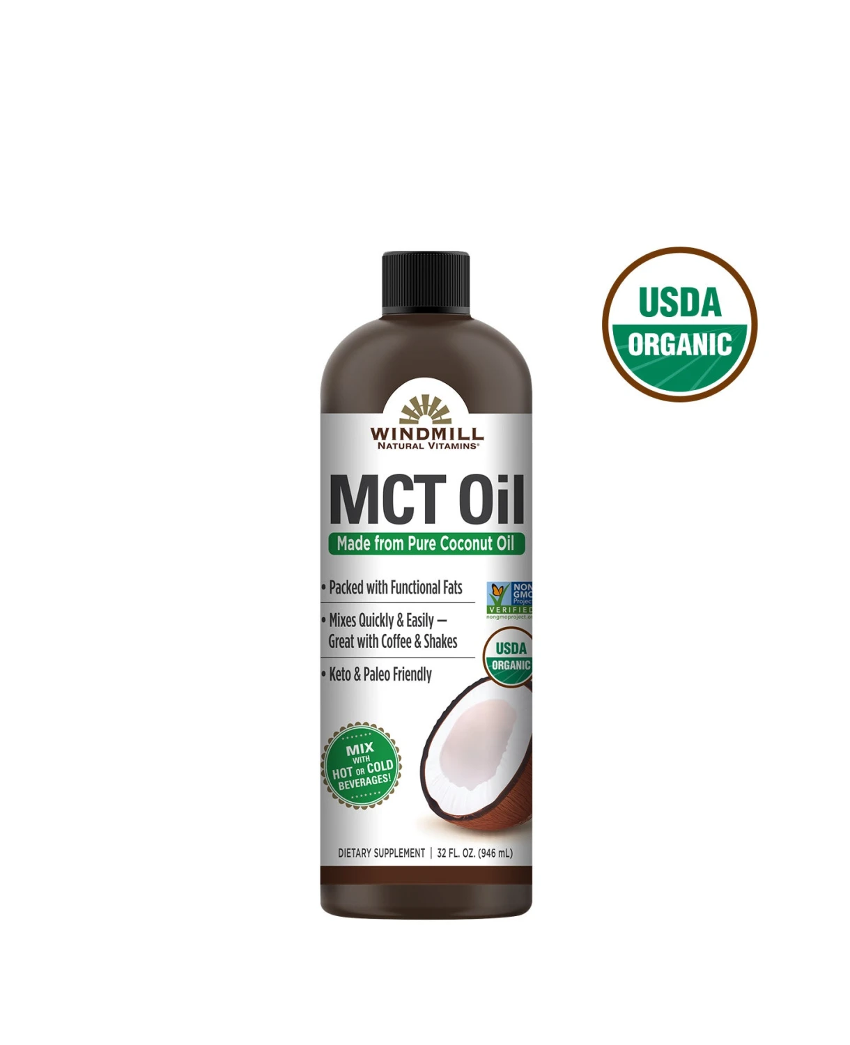 Organic MCT Oil của Windmill Natural Vitamins được chứng nhận là sản phẩm hữu cơ USDA và được chứng nhận bởi Non-GMO Project Verified, được làm từ dừa nguyên chất.