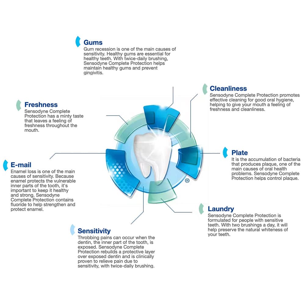 Sensodyne Complete Protection thúc đẩy quá trình làm sạch hiệu quả cho vệ sinh răng miệng tốt, giúp mang lại cảm giác tươi mát và sạch sẽ cho miệng.