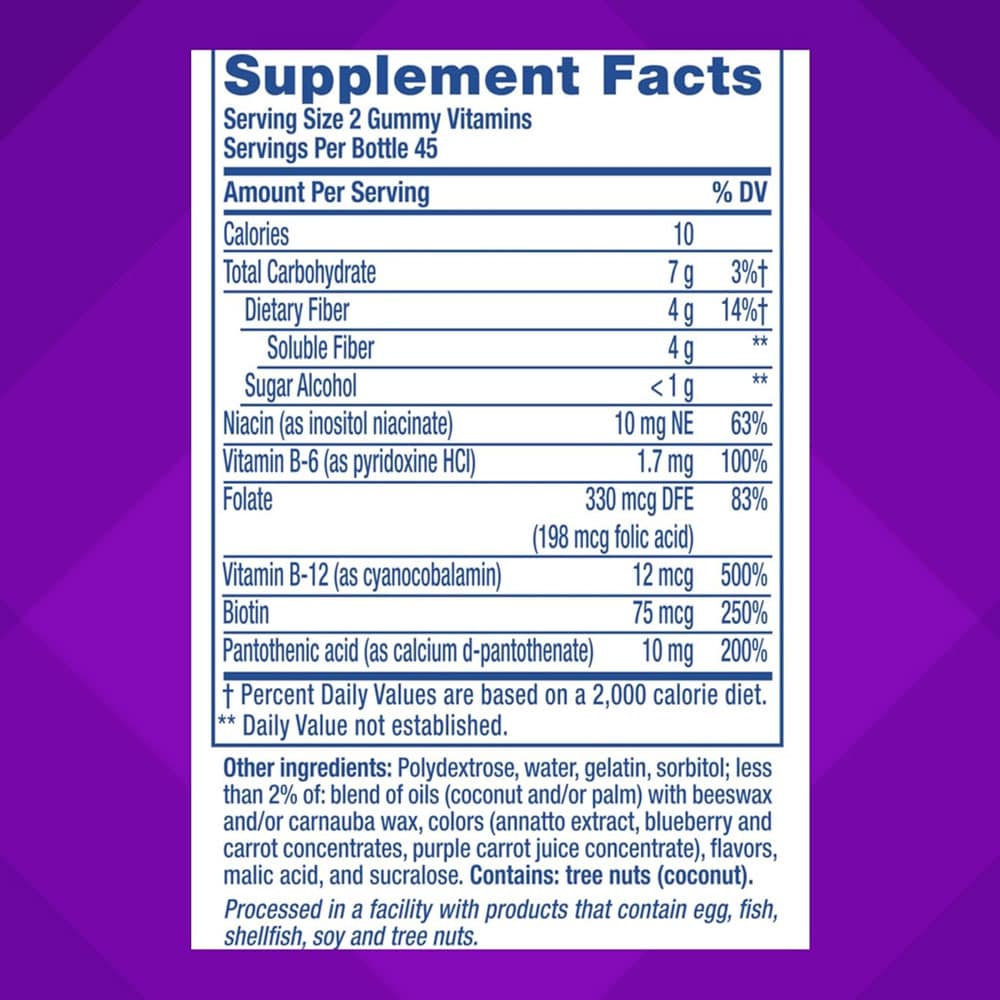 Thành phần khác: Polydextrose, water, gelatin, xylitol; less than 2% of: blend of oils (coconut and/or palm) with beeswax and/or carnauba wax, colors (annatto extract, blueberry and carrot concentrates, purple carrot juice concentrate), malic acid, natural flavors, and sucralose. Contains: tree nuts (coconut).