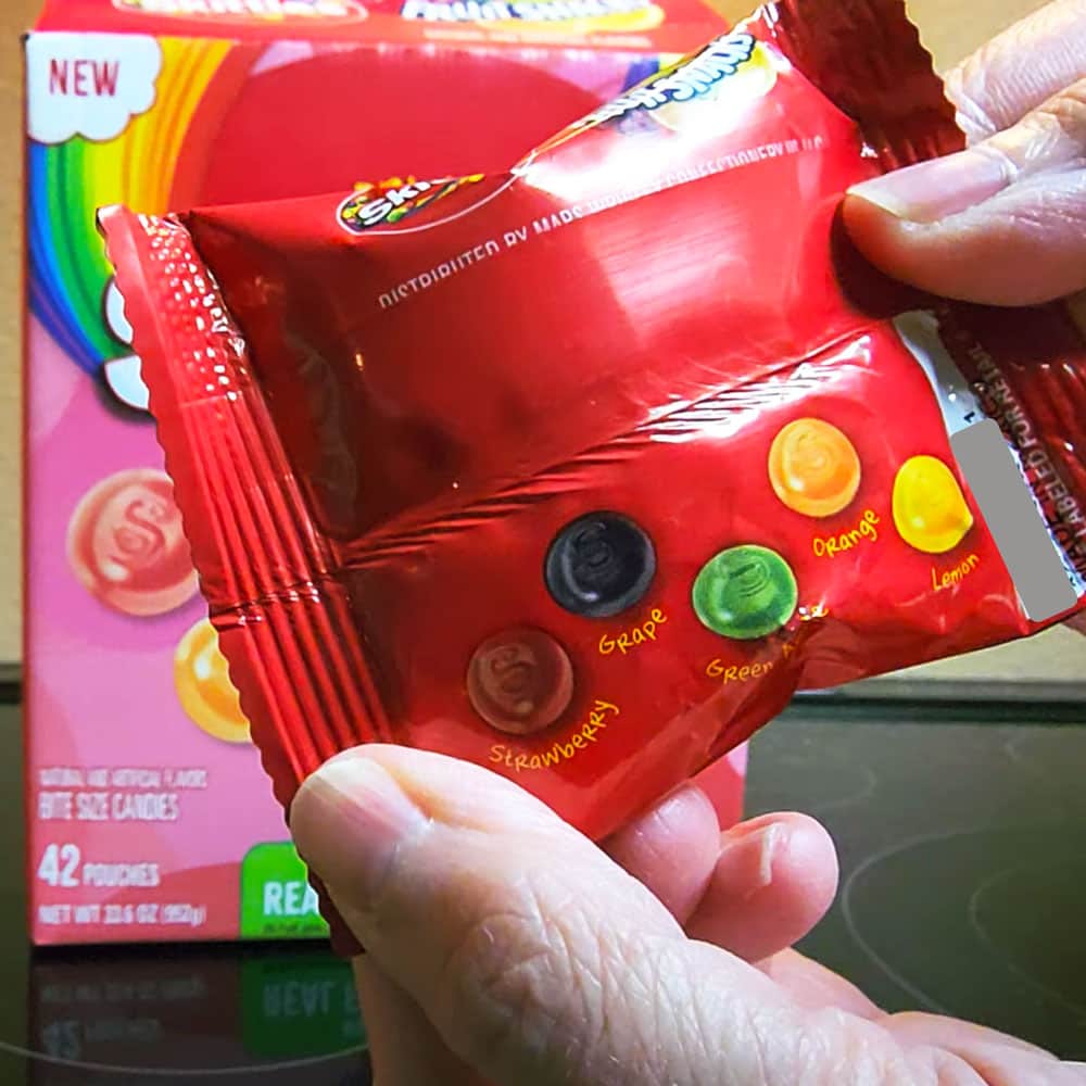 Skittles Fruit Snacks có 5 hương vị với kẹo Skittles — Dâu tây, Nho, Cam, Chanh và Táo xanh — và mọi hương vị đều hoàn hảo. Vị nào cũng ngon và cuốn. Ví dụ như Skittles chanh có vị chua chua ngọt ngọt và thơm chanh.
