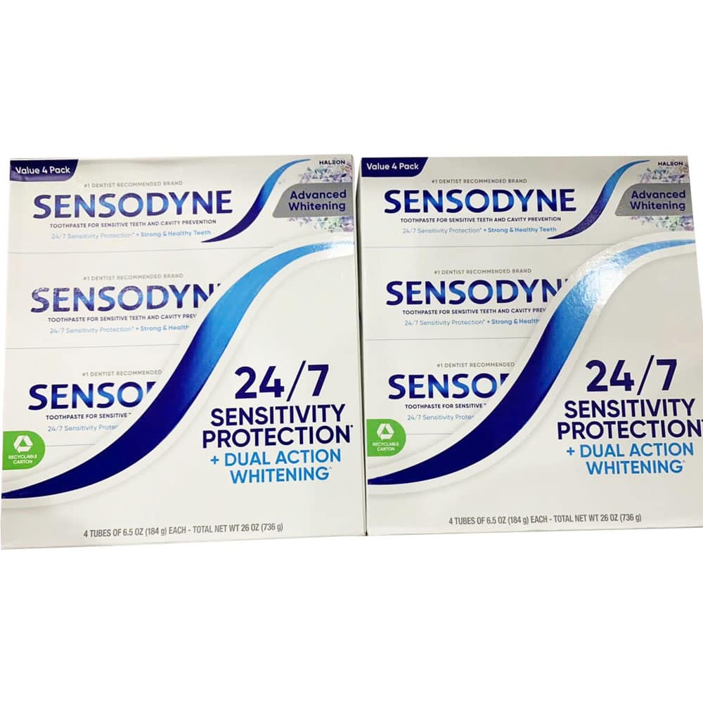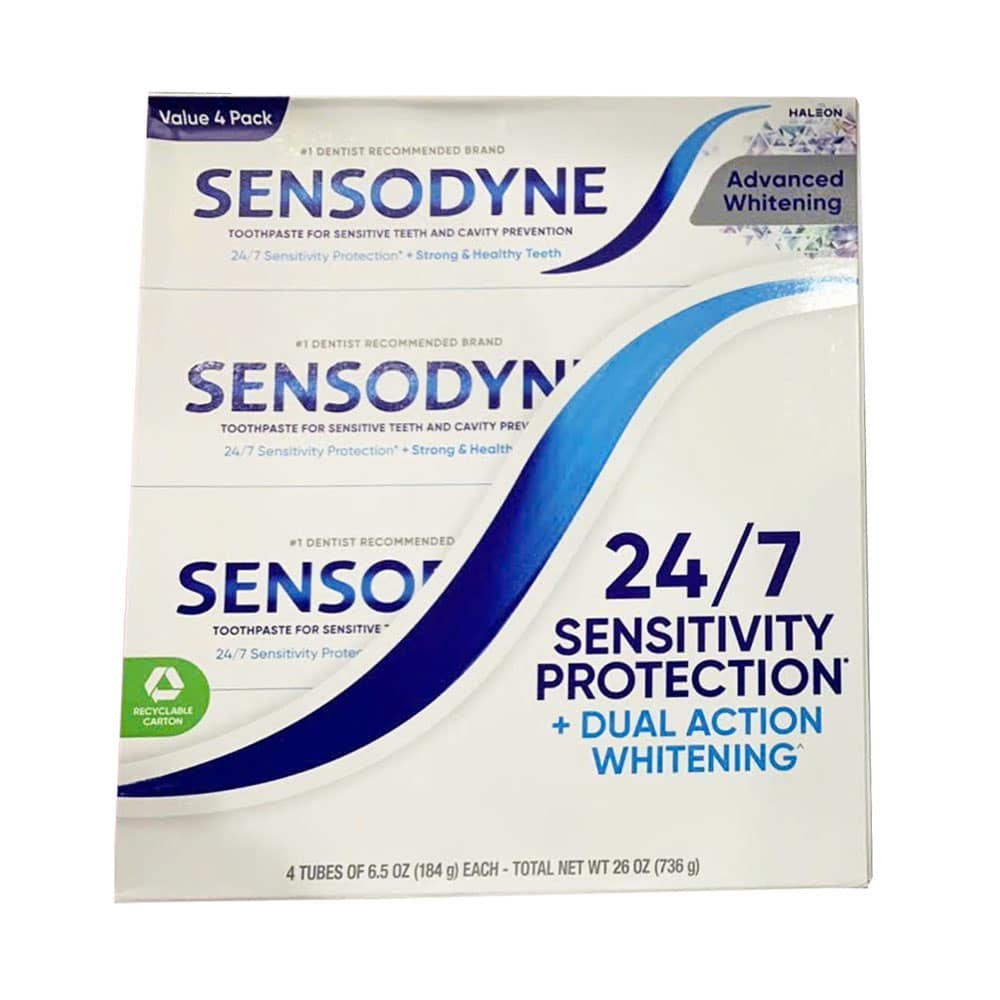 Kem đánh răng Sensodyne Advanced Whitening có chứa kali nitrat giúp làm dịu các dây thần kinh bên trong răng khỏi cảm giác đau nhức do các tác nhân gây ra.
