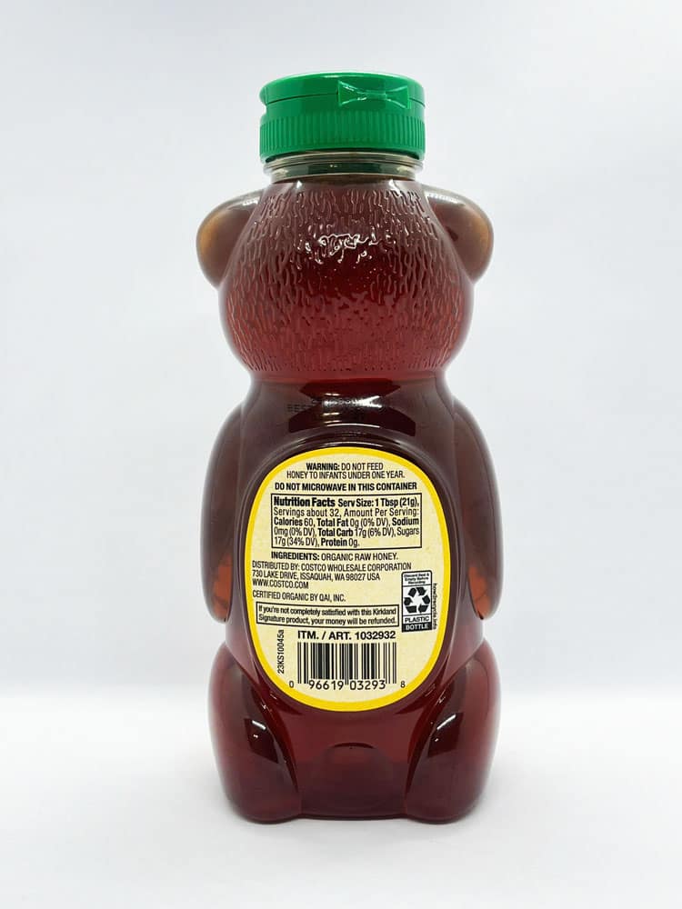 - Mật Ong Kirkland Organic Honey với thành phần từ mật ong nguyên chất, đảm bảo độ tinh khiết và không có sử dụng những hóa chất độc hại trong quá trình sản xuất. Mật ong Kirkland có chứa 80% hàm lượng đường fructoza, glucoza và 20% còn lại là nước và các khoáng chất, các vitamin, protein, các chất chống oxi hóa. Các vitamin được tìm thấy trong mật ong là B6, niacin, thiamin, riboflavin và một lượng axit amin. Các khoáng chất có trong mật ong phải kể đến như canxi, sắt, magiê, mangan, kali, phốt pho, natri và kẽm. Nhờ những thành phần này mà mật ong có tính kháng khuẩn, khử trùng và mật ong được xem như là một sản phẩm diệu kì.