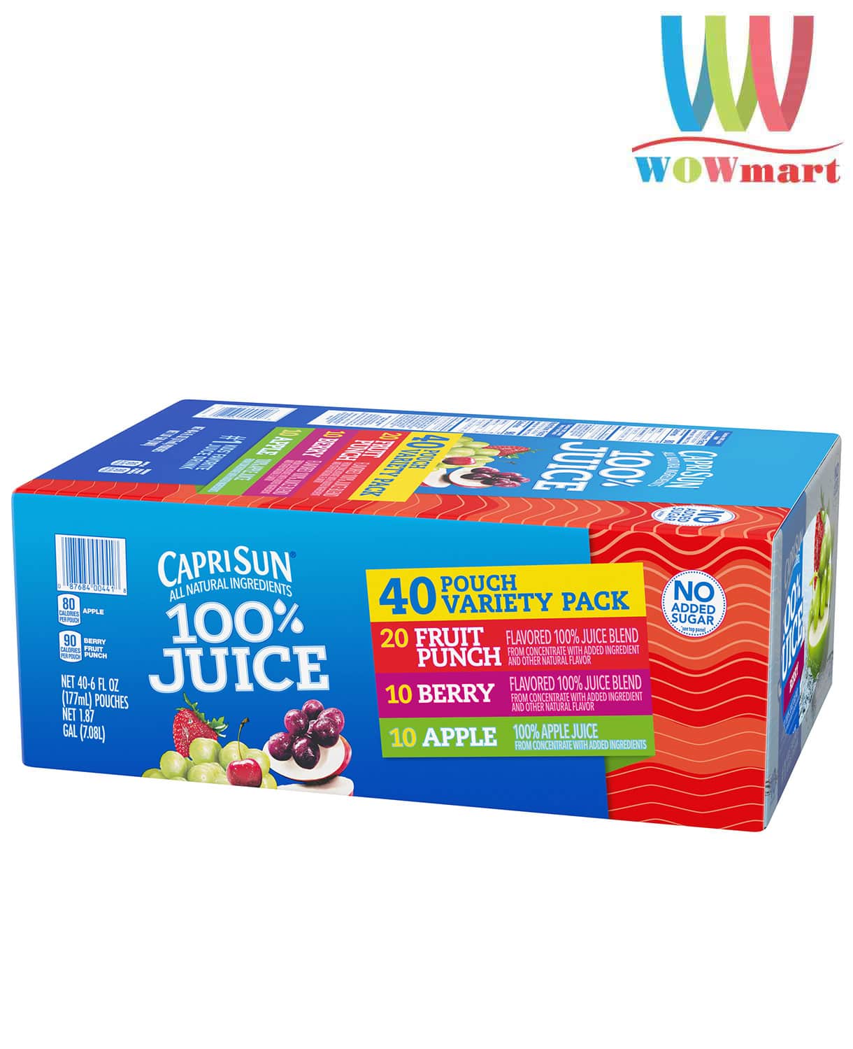 Nước ép trái cây Capri Sun 100% Juice túi 177ml cung cấp ¾ cốc Nước ép trái cây (là 1/2 khẩu phần trái cây theo Hướng dẫn Chế độ ăn uống của Hoa Kỳ). Những chiếc túi mang đi này không có thêm đường, để giúp đáp ứng các yêu cầu phục vụ trái cây và không chứa bất kỳ loại xi-rô ngô nào có đường fructose cao. Làm cho thời gian ăn trưa và ăn nhẹ của bạn trở nên thú vị với thức uống nước trái cây giải khát này!
