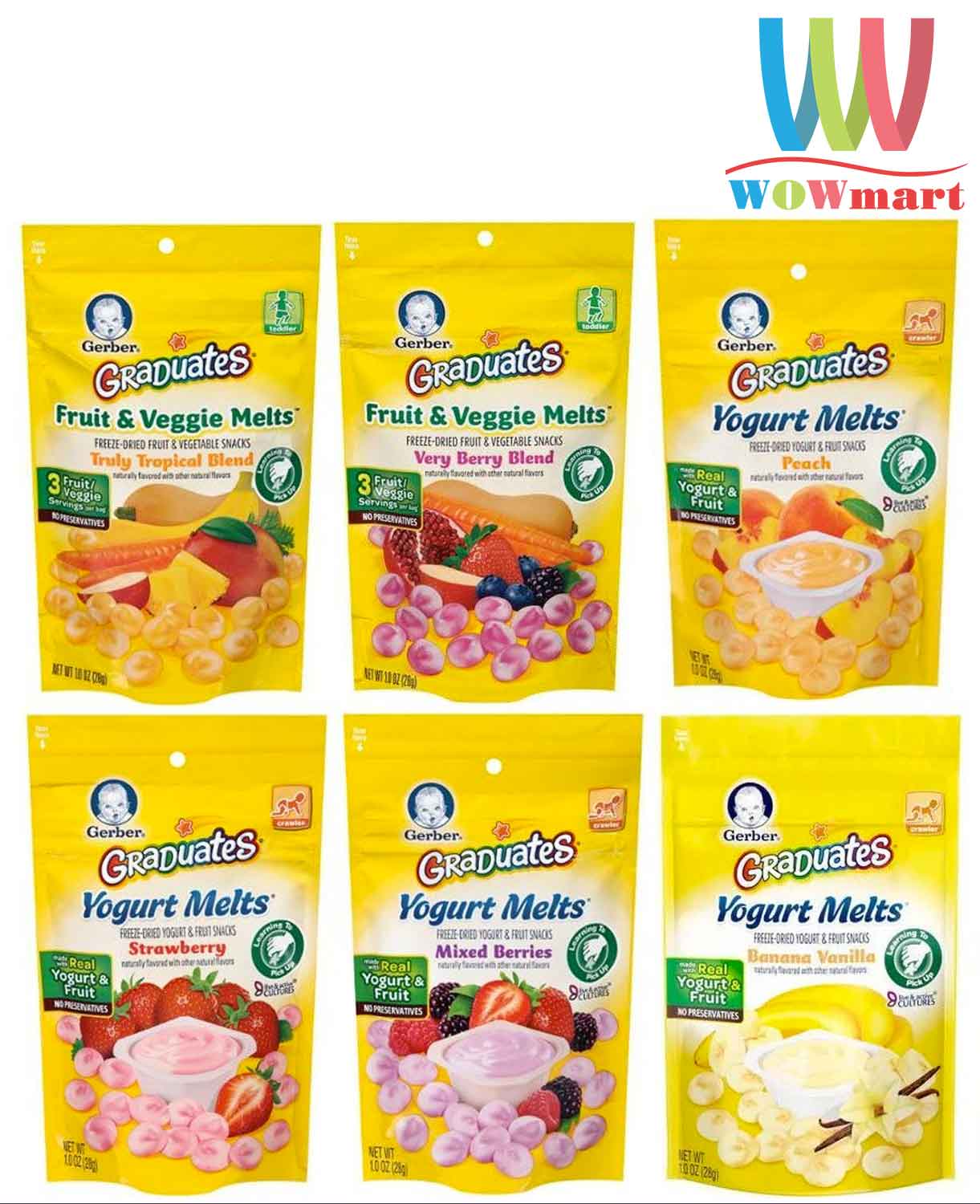 – Những viên Yogurt Melts Gerber Graduates sẽ là món ăn nhẹ tuyệt vời dành cho trẻ sơ sinh ở giai đoạn bé học hỏi và khám phá. Yogurt Melts được làm từ sữa chua và trái cây tươi ngon dễ nhai, dễ tan trong miệng và làm bé thích thú dùng vì vị ngon lạ của chúng.