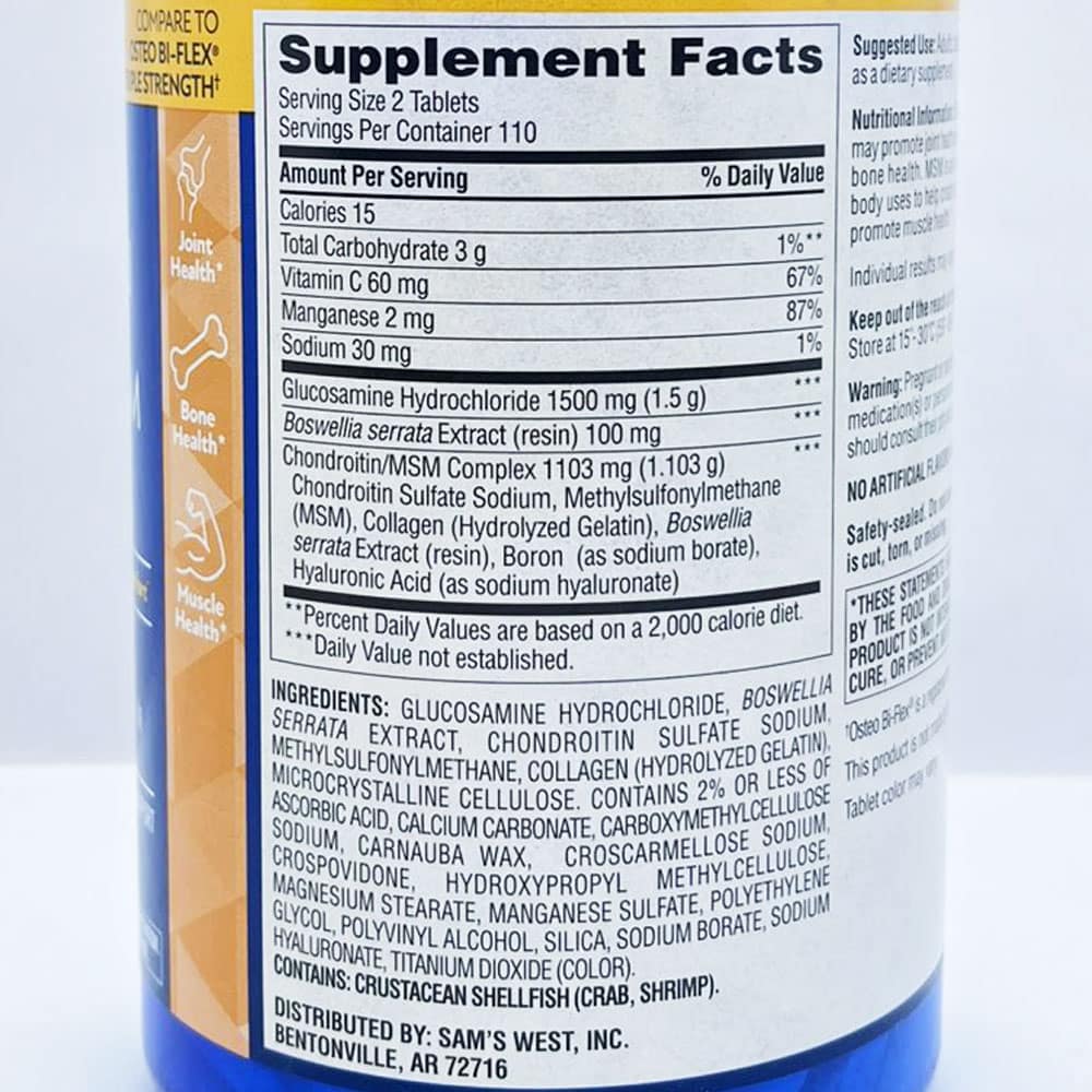 Thành phần viên uống bổ sụn khớp Member’s Mark Triple Strength Glucosamine 1500mg Chondroitin MSM 1288mg