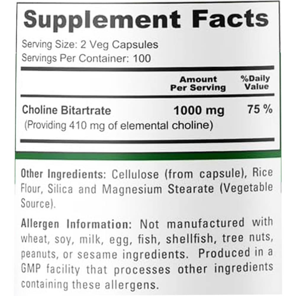 Thành phần: Choline Bitartrate, Cellulose (veggie capsule), Rice Flour, Silica, Magnesium Stearate (Vegetable Source).