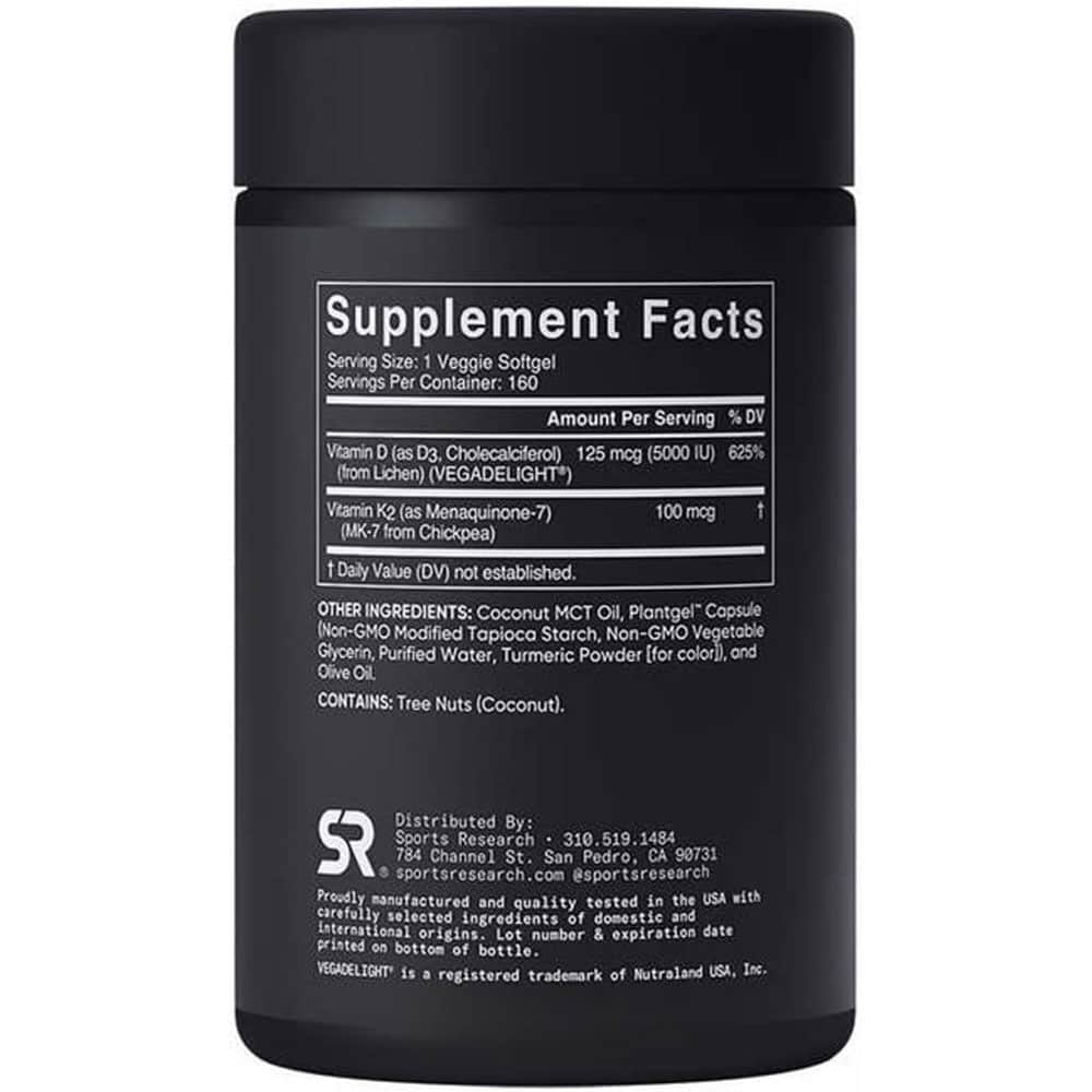 SR™ Vitamin D3 + K2 kết hợp VegaDELight™ Vegan D3 (dưới dạng Cholecalciferol từ Địa y) và MenaQ7® K2 (dưới dạng Menaquinone-7 từ đậu xanh) với Dầu dừa nguyên chất trong PlantGel™ được chứng nhận thuần chay.