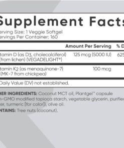 Viên uống bổ sung Vitamin D3 + K2 SR with Coconut Oil là sự kết hợp của 125mcg (5000IU) Vitamin D3 và 100 mcg Vitamin K2 (dưới dạng MK-7). Vitamin D3 (dưới dạng Cholecalciferol) thì được cung cấp dạng vitamin D có hoạt tính sinh học tương tự được sản xuất trong cơ thể do ánh sáng mặt trời trực tiếp mà không có nguy cơ tiếp xúc với tia UVB không được bảo vệ.
