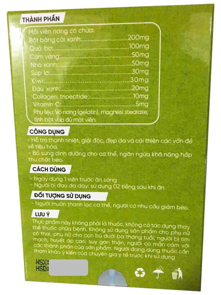 Viên uống Detox Slimming Care Green Fruits And Vegetables là viên uống được làm từ trái cây và rau xanh mang lại nhiều lợi ích cho sức khỏe của bạn. Thực phẩm xanh giàu chất xơ, vitamin và chất dinh dưỡng thực vật, ít calo giúp giữ dáng, đẹp da, hỗ trợ quá trình lão hóa khỏe mạnh (chống lão hóa), để bạn luôn cảm thấy trẻ khỏe và nhiều năng lượng.