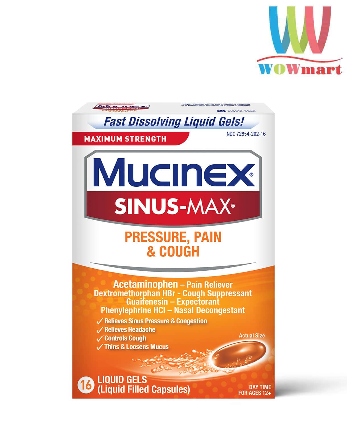 Mucinex Sinus-Max Pressure, Pain, & Cough giúp bạn đẩy được “Mr. Mucus” trơn tru ra khỏi mũi họng với 3 thành phần sức mạnh tối đa. Guaifenesin – 200mg – Long đờm; Phenylephrine HCl – 5mg – Thông mũi; Acetaminophen – 325mg – Giảm chứng đau nhức/ Giảm sốt.