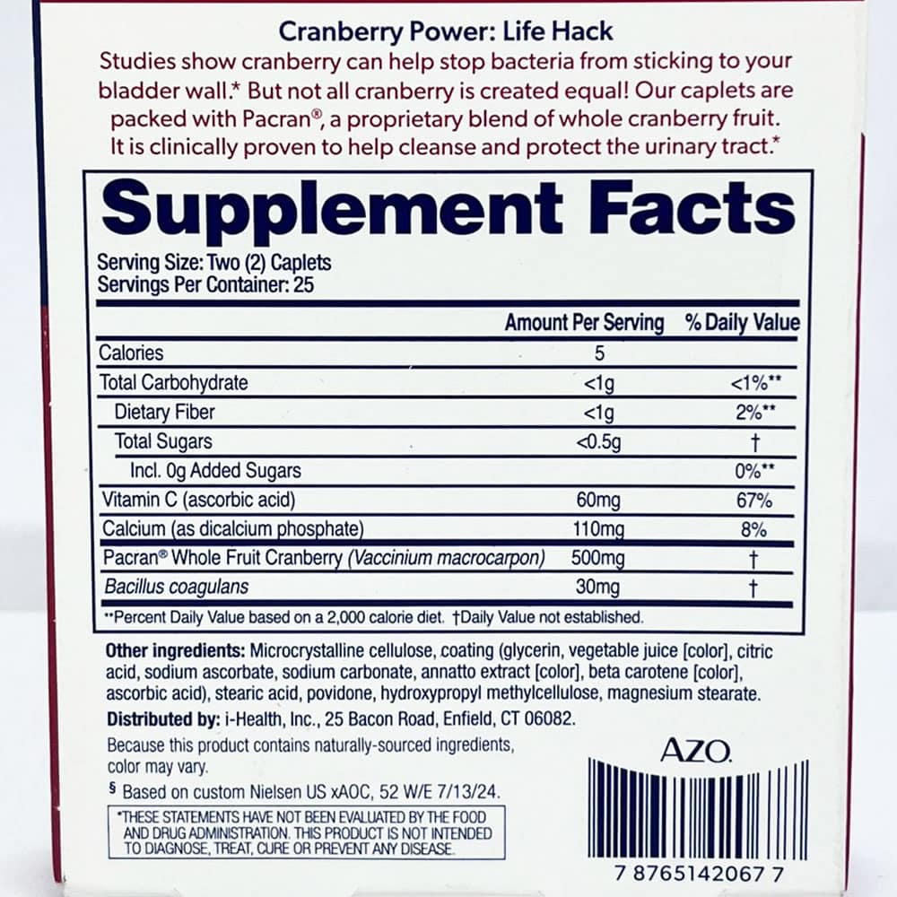 AZO® Cranberry Caplets được làm từ Pacran® (đã được chứng minh lâm sàng), một hỗn hợp độc quyền của quả nam việt quất nguyên quả giúp làm sạch và duy trì đường tiết niệu sạch sẽ.