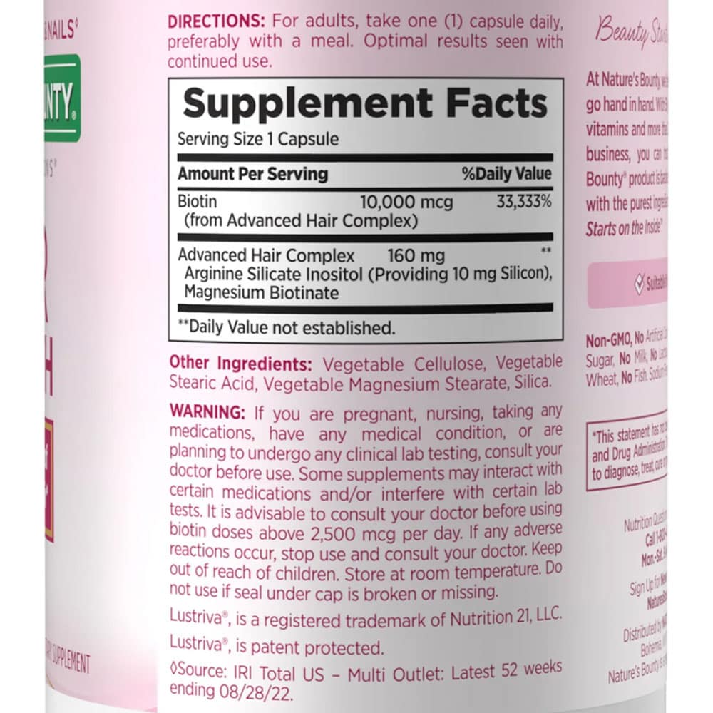 – Trong một nghiên cứu lâm sàng, thành phần hoạt tính trong Nature’s Bounty® Optimal Solutions® Hair Growth đã được chứng minh là giúp tóc mọc dày hơn, đầy đặn hơn trong ba tháng. Kết quả có thể khác nhau ở mỗi người.