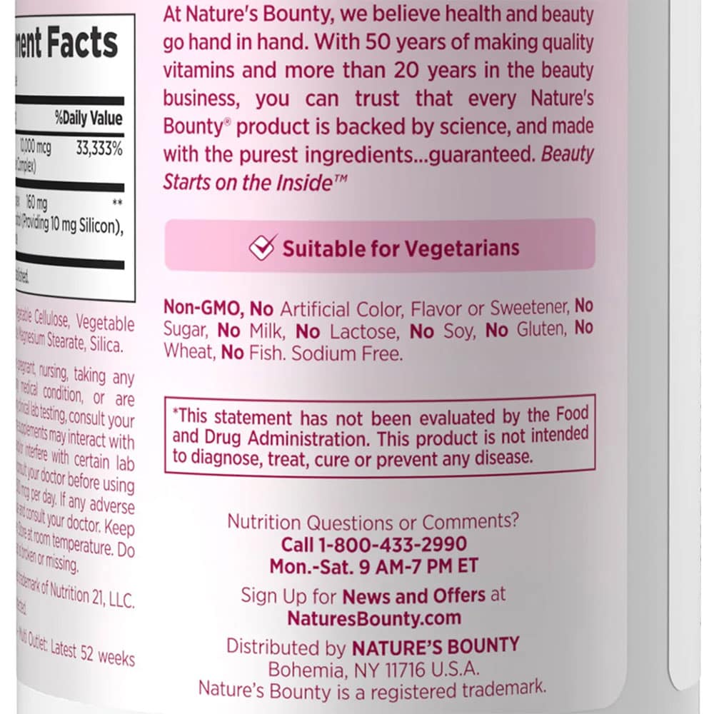 – Không, chúng tôi không khuyến nghị uống nhiều hơn một viên nang mỗi ngày. Công thức cải tiến, một viên mỗi ngày của Nature’s Bounty cung cấp các chất dinh dưỡng quan trọng để hỗ trợ mái tóc dày hơn, bồng bềnh hơn chỉ với một viên nang mỗi ngày.