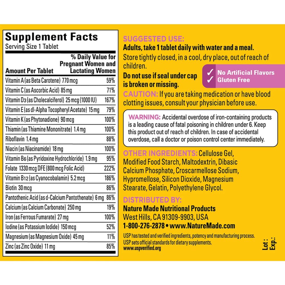 Mỗi khẩu phần 1 viên chứa: 770 mcg Vitamin A, 85 mg Vitamin C, 25 mcg Vitamin D3, 15 mg Vitamin E, 90 mcg Vitamin K, 1.4 mg Thiamin, 1.4 mg Riboflavin, 18 mg Niacin, 1.9 mg Vitamin B6, 1330 mcg DFE Folate (800 mcg Folic Acid), 5.2 mcg Vitamin B12, 30 mcg Biotin, 6 mg Pantothenic Acid, 250 mg Calcium, 27 mg Iron, 150 mcg Iodine, 45 mg Magnesium, 11 mg Zinc.