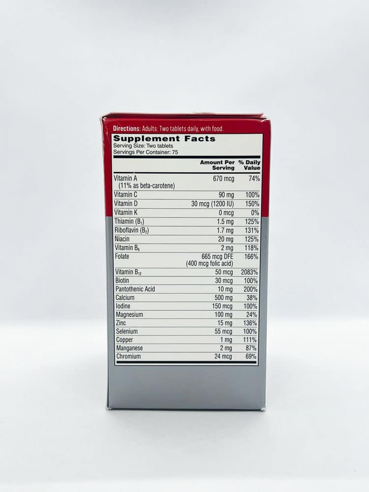 Vitamin tổng hợp hàng ngày này chứa các chất dinh dưỡng quan trọng như Vitamin A, B6, B12, C và D, Riboflavin, Thiamin, Niacin, Axit folic, Biotin, Axit Pantothenic, I-ốt, Magiê, Selen, Đồng, Crom, Canxi, Kẽm và Mangan.